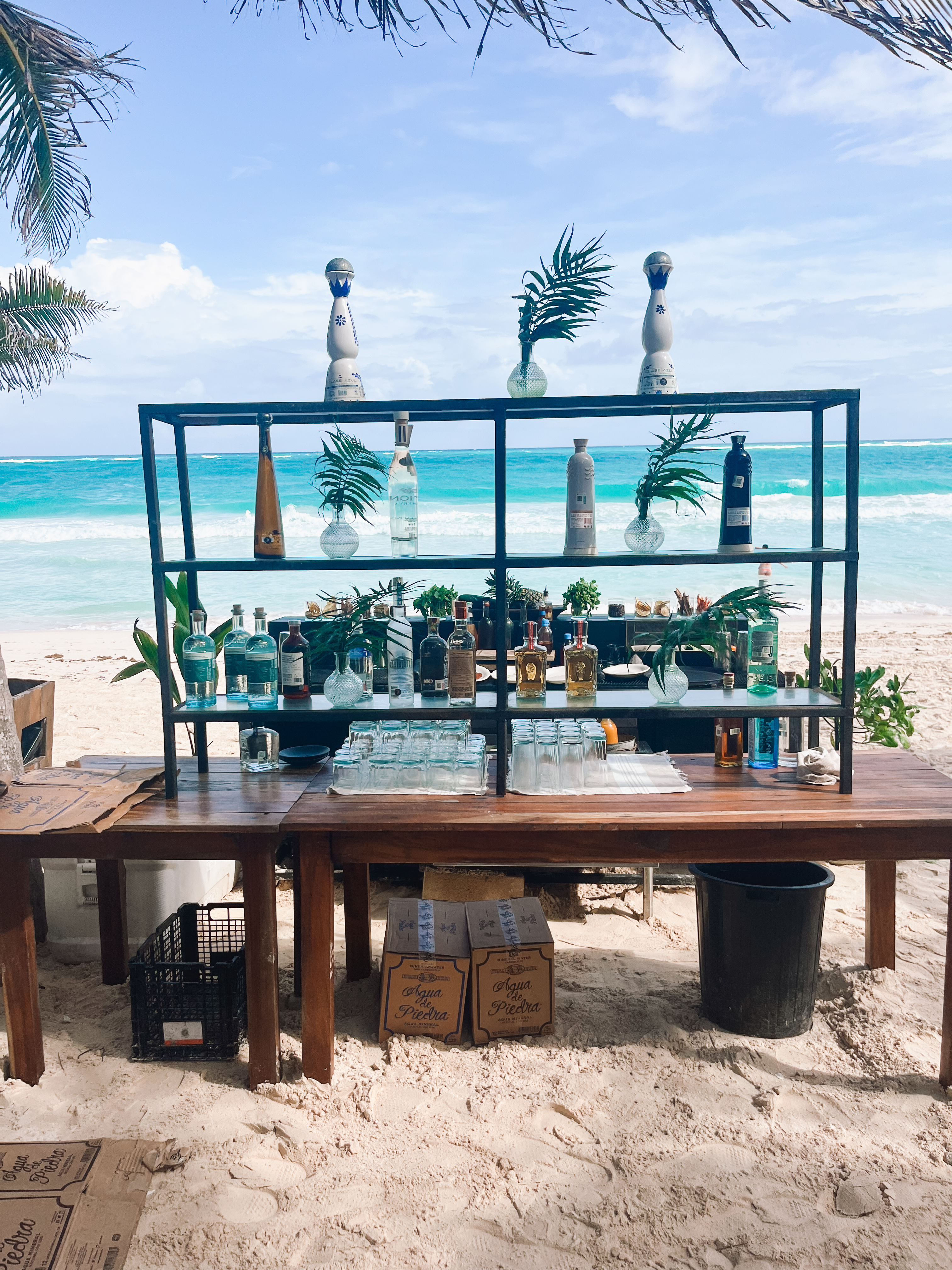 - Gitano Beach Club: This is where we went. Gitano is a Tulum institution. It was one of the first cool cocktail bars on the strip and despite that- it is still one of the coolest years later. They recently opened up a sister location called Gitano Beach Club and it’s beautiful. What I liked about it here is that it is a bit more tame and refined than some of the ones below. They have a DJ and it’s a vibe but you can still enjoy your food, hit the ocean and hear yourself think. ( $80-$150 minimum spend depending on if you want a daybed, cabana etc)