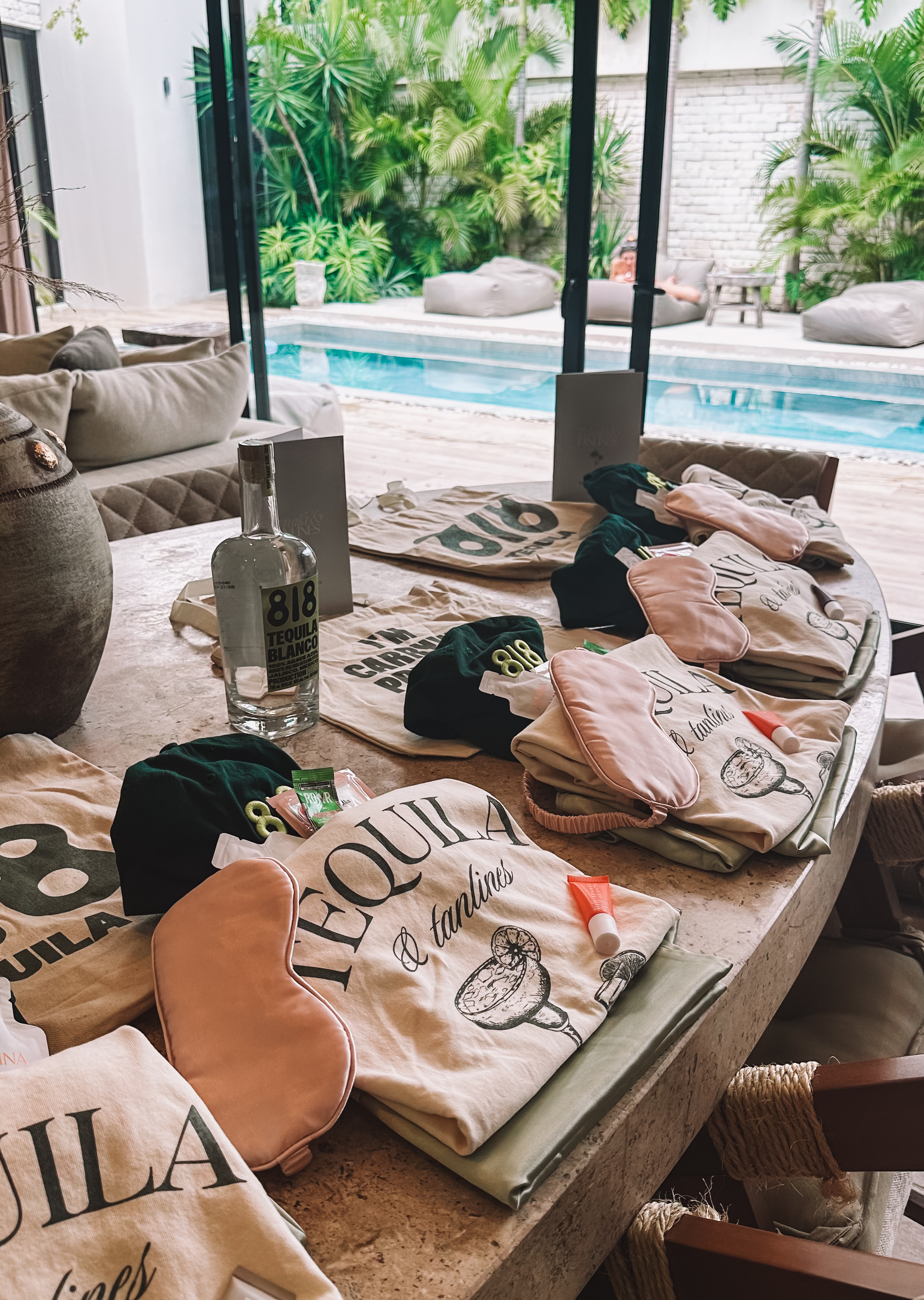 Since my friends travelled all the way to Mexico for my birthday, I wanted to get them a little something upon their arrival. In their welcome kit I included a custom shirt that I had made on Etsy ( ours said Tequila and Tulum but you can do whatever saying you want/pick colours!). I added in a sleep mask, a Summer Friday lip balm and some masks! All items are linked below