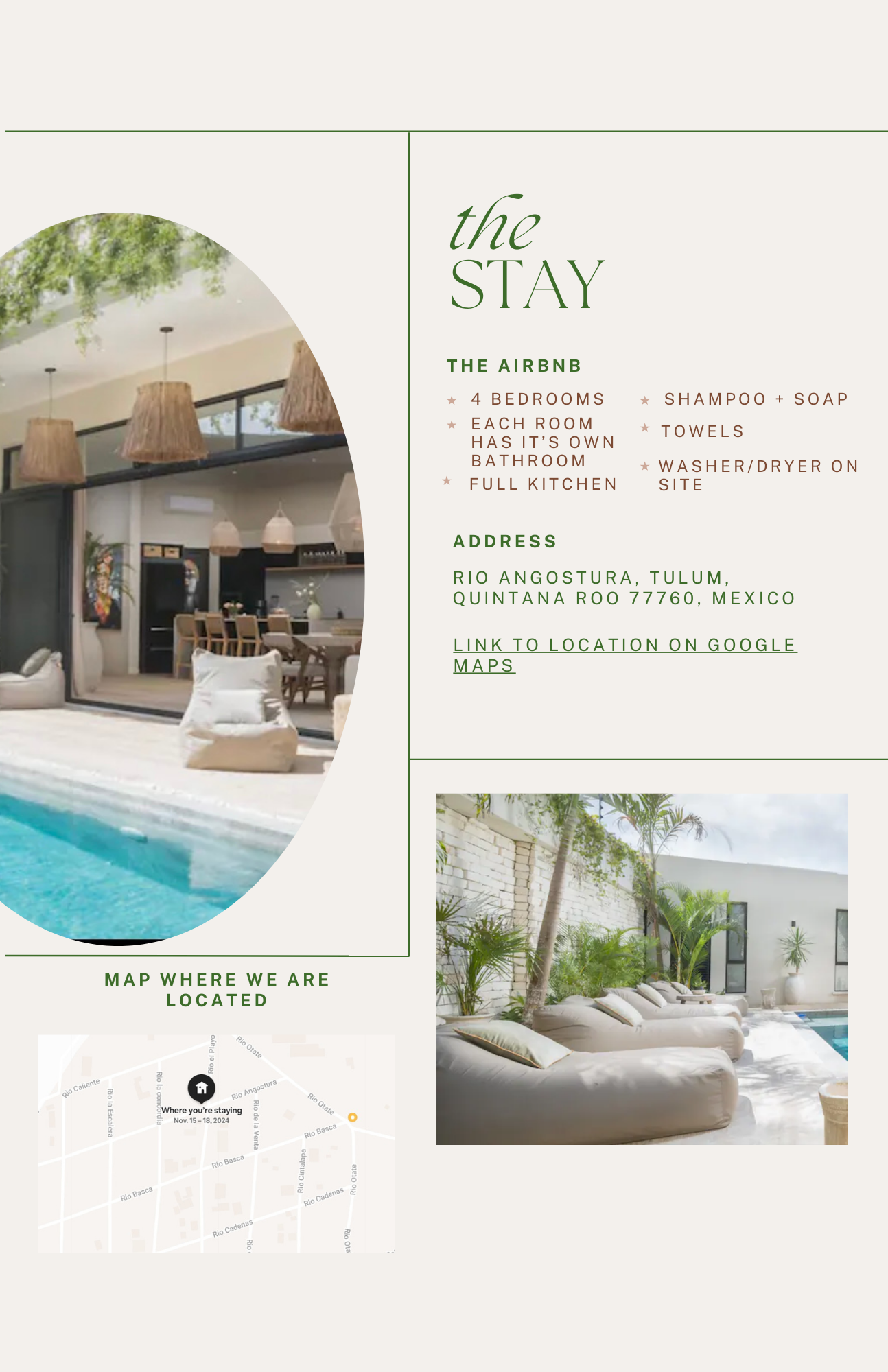 Our Airbnb called Casa Amor was all of these things plus more. Not only did the place check all the boxes but the hosts literally set up SO much for us. They set up the private chefs we had for breakfast and dinner some of the nights, massages for us, transportation and even arranged for groceries and food to be there upon our arrival!