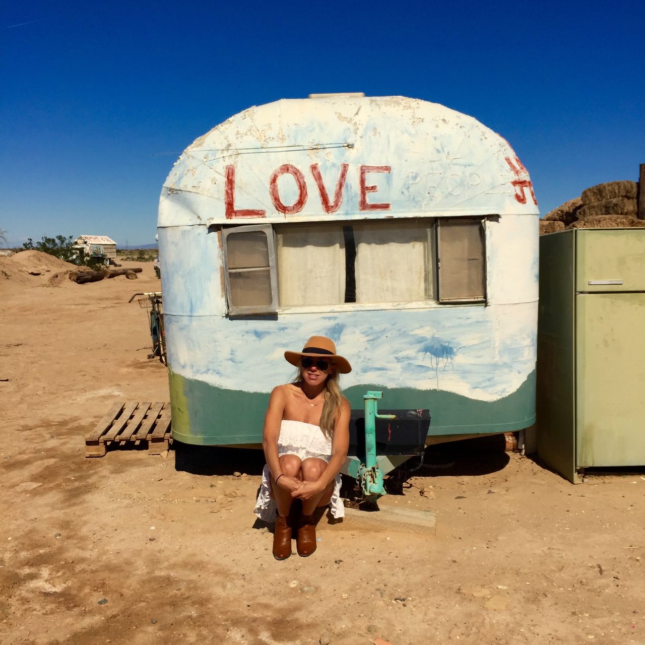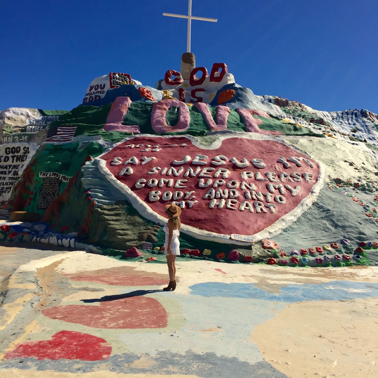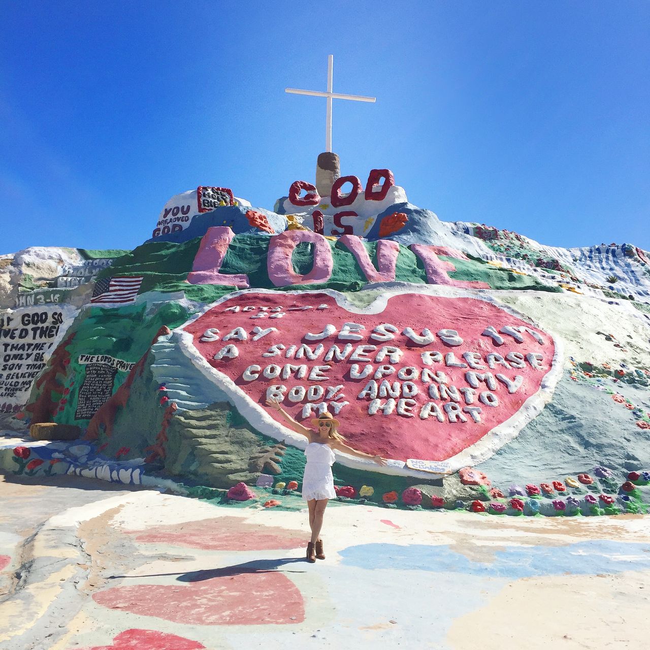 Salvation Mountain is located in a town called Slab City and it is literally a whole different world there! I mean this place is so far off the beaten path – there were no roads, no traffic lights….. no signs of life like we know! Driving down the path- we started to spot trailers, misfits, hippies and rednecks….but all very spread out and very far removed from any sort of stores ( I’m talking MILES!). I thought the main attraction was Salvation Mountain but seeing how some of these people live was part of the fun! Do they have cable? Do they have phones? Do they have running water? What do they eat? We spent hours googling this tiny piece of land afterwards!