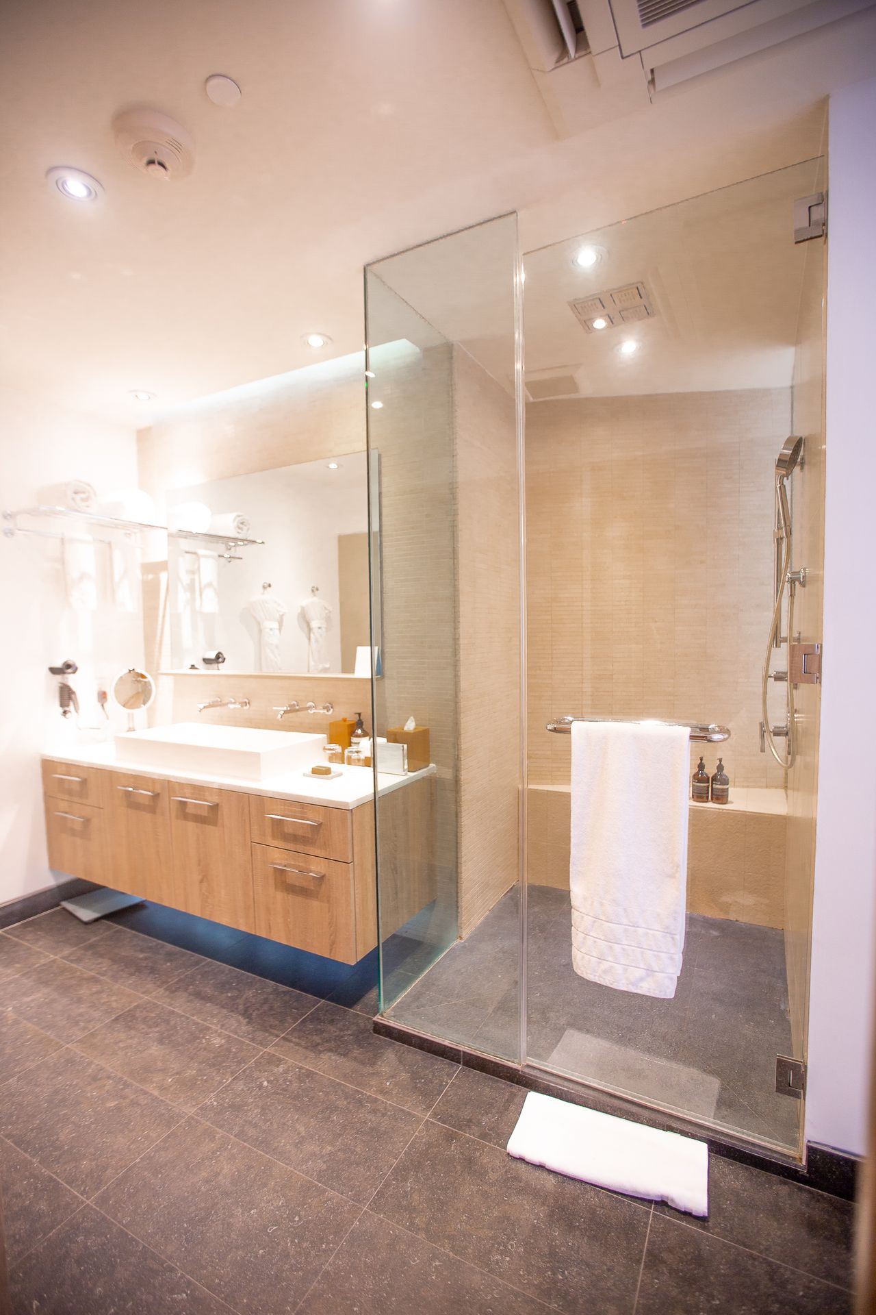 Other amazing features in the bathroom: Dyson Hairdryers, Plush bathrobes, Nail Kit, and flip flops to wear.